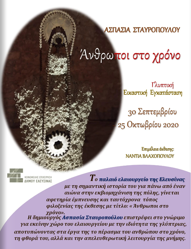 Συνέντευξη με την γλύπτρια Ασπασία Σταυροπούλου και ξενάγηση στην έκθεσή της "Άνθρωποι στον Χρόνο" στο παλαιό ελαιουργείο της Ελευσίνας.